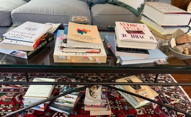 I’m sitting on my couch looking at the overflowing cornucopia of books on my coffee table. So covered with books there’s no place for coffee… and more books lie in wait underneath. Each book is a promise: to take me on a journey; to teach me something; to make me think; to inspire me.