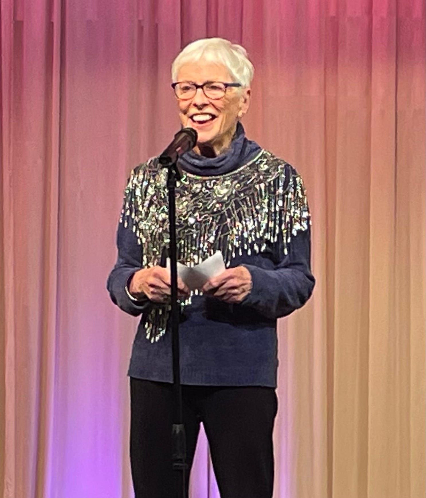 Let me say—crafting a story worth telling is a whole new art form for me, and it’s a lot more intense work—both inner and as craft—than I expected. Like a years worth of therapy in a month. Tonight was the performance and I survived. In fact it went much better than I expected. Anyway, a friend took this picture, and I look like I’m actually having fun.